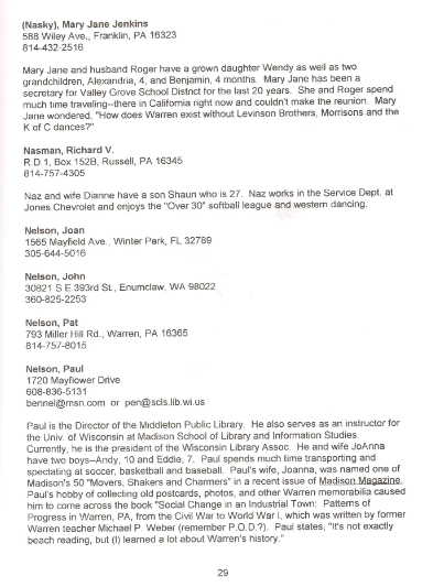 During the month prior to our Warren visit, I had been meaning to write a note to Rick Dies, a high-school classmate and perennial member of the reunion planning committee. I wanted to ask him if I could buy a copy of the publication that contains biographical information that members of the class of ’68 send in. I enjoyed paging through the copy I received at the 1988 reunion, finding out where people lived, where they worked, whether they had children, what they liked to do.